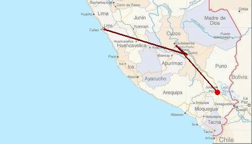 's Avonds zijn we gaan eten met onze vrienden van de incatrail. Een van hen heeft na keiharde onderhandelingen een menu voor 10 sol geregeld met soep, apalca, 2 glazen wijn, cola en koffie toe. Daarna (10 uur) meteen op de bus naar Puno. De bus was heerlijk lux met veel beenruimte, dat hadden we zo geregeld. Helaas duurde dat alleen tot buiten het busstation. Daar kwamen namelijk een lading Peruanen binnen die voor een vijfde van de prijs in onze beenruimte gingen zitten.