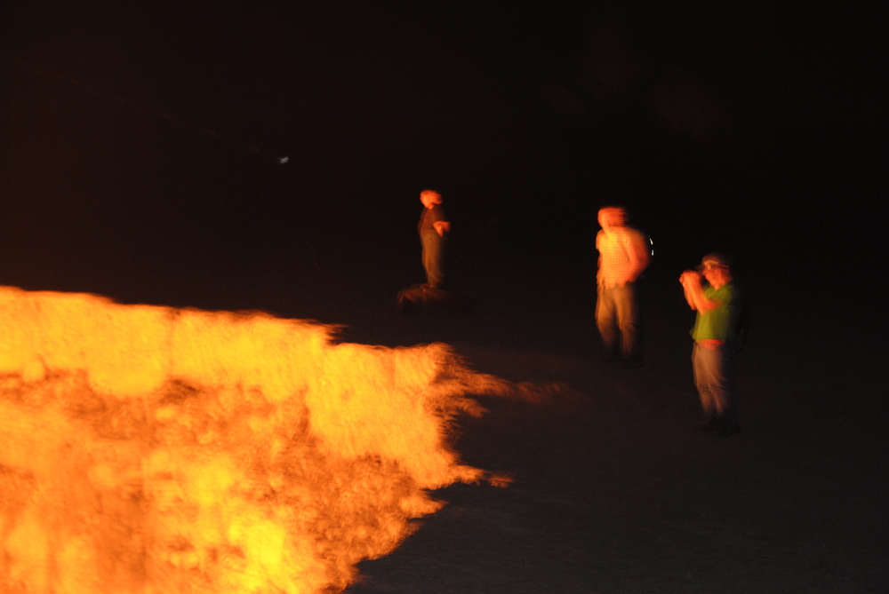 Samen met Sam (een andere reiziger) zijn we om 18:00 vertrokken naar de gaskrater. Twee uur later wees onze chauffeur naar een boortoren en zei "arrive". Wij kwamen natuurlijk niet voor de boortoren! De baas daar begreep wat we wilden zien, maar we zouden daar alleen kunnen komen met een grote truc. Voor wat geld konden we de chauffeur regelen en door de woestijn naar de kraters. Erg indrukwekkend!!