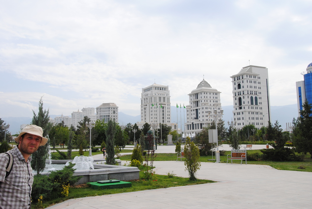 Vervolgens naar Ashgabat, de hoofdstad van de gekke Turkmenistanse presidenten. In Mary waren we wel gewend geraakt aan de zelfverheerlijking met de gouden standbeelden, maar Ashgabat was weer een heel ander verhaal. De vorige president had de oude stad platgewalst en een nieuwe stad gebouwd met marmeren gebouwen en parken... Er lopen alleen schoonmakers en politieagenten in deze stad en natuurlijk Job en Koen ;)